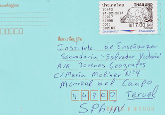 El viernes recibimos en el Instituto una postal procedente nada menos que de Tailandia. Nos la envía el intrépido Frank Cuesta, a quien  le damos un GRACIAS enorme por haberse acordado de unos chavales de Monreal que siguen su trabajo con admiración.